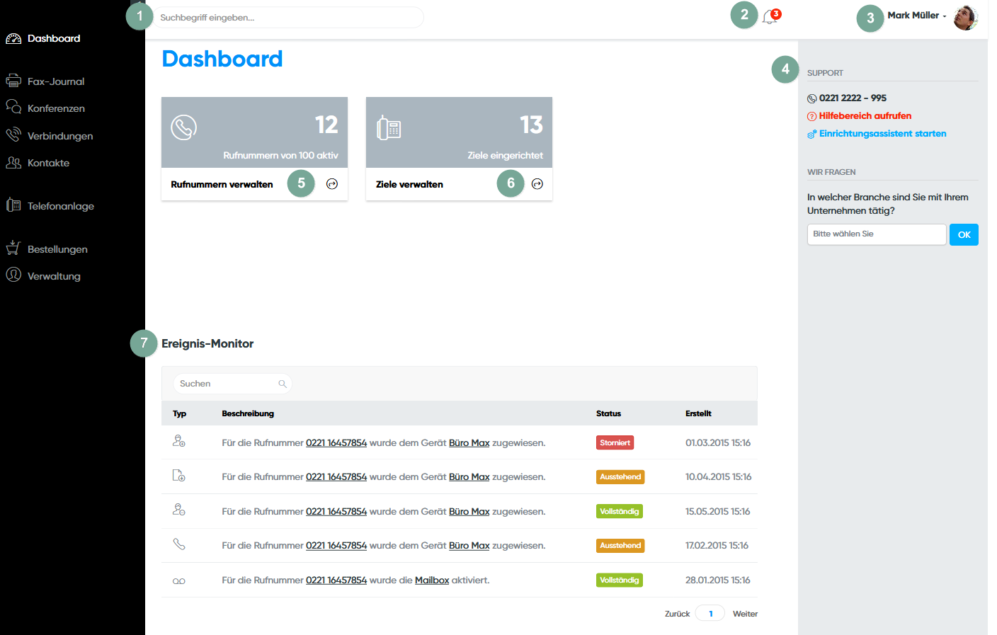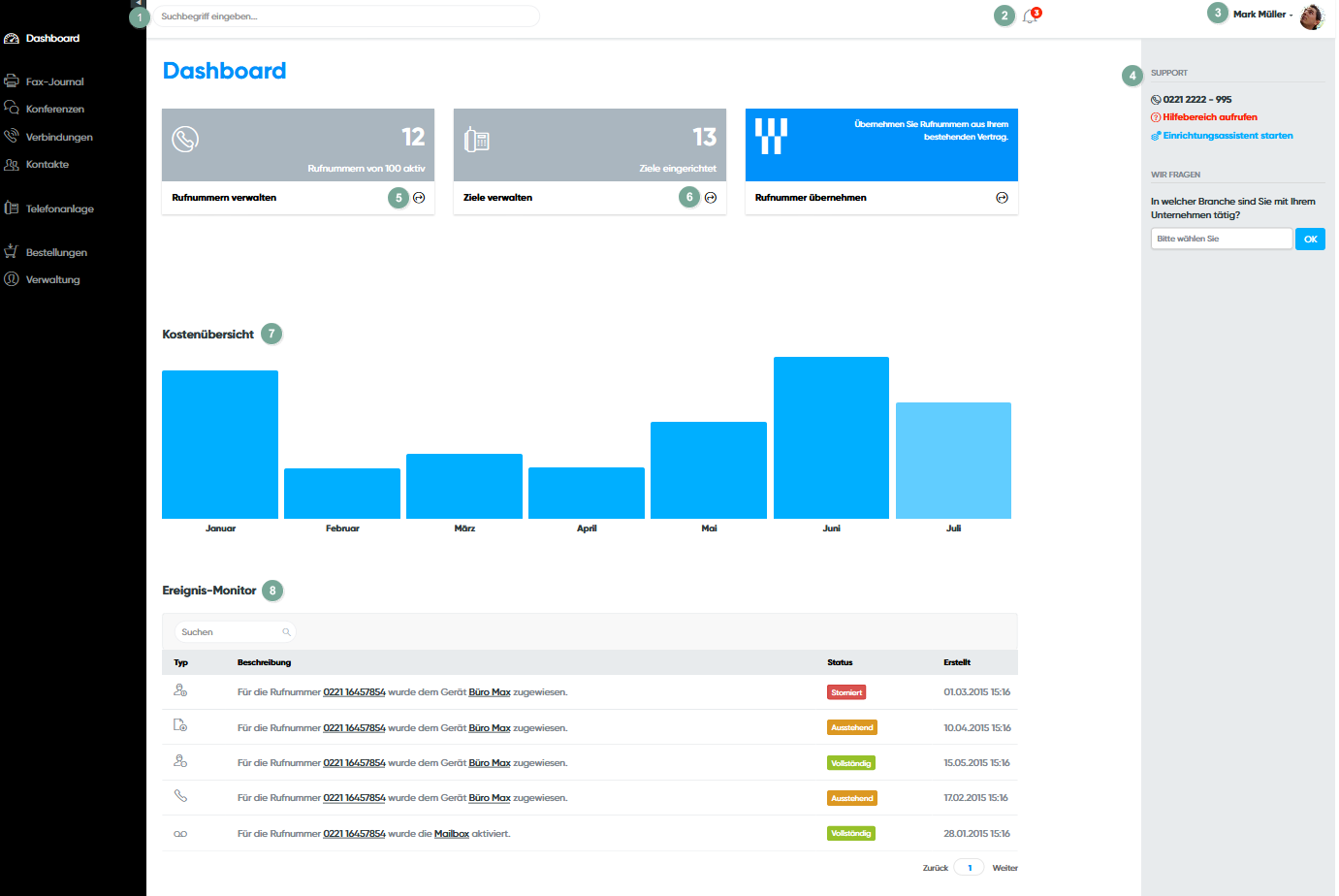 Das Dashboard ist wie Ihr Cockpit zu Ihrem Cloud PBX Konto. Hier holen Sie sich eine Übersicht über alle Informationen und gelangen von hier aus schnell zu den wichtigsten Funktionen Ihrer virtuellen Telefonanlage.