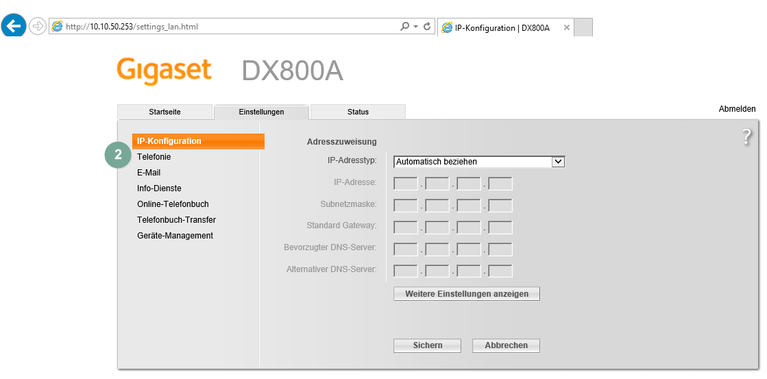 - Öffnen Sie Ihren Internet-Browser und tippen Sie die IP-Adresse Ihres Gerätes in die Adresszeile des Browsers ein. Achtung: Nicht die Nullen am Anfang angeben. Obige Adresse wäre also 10.10.50.153.