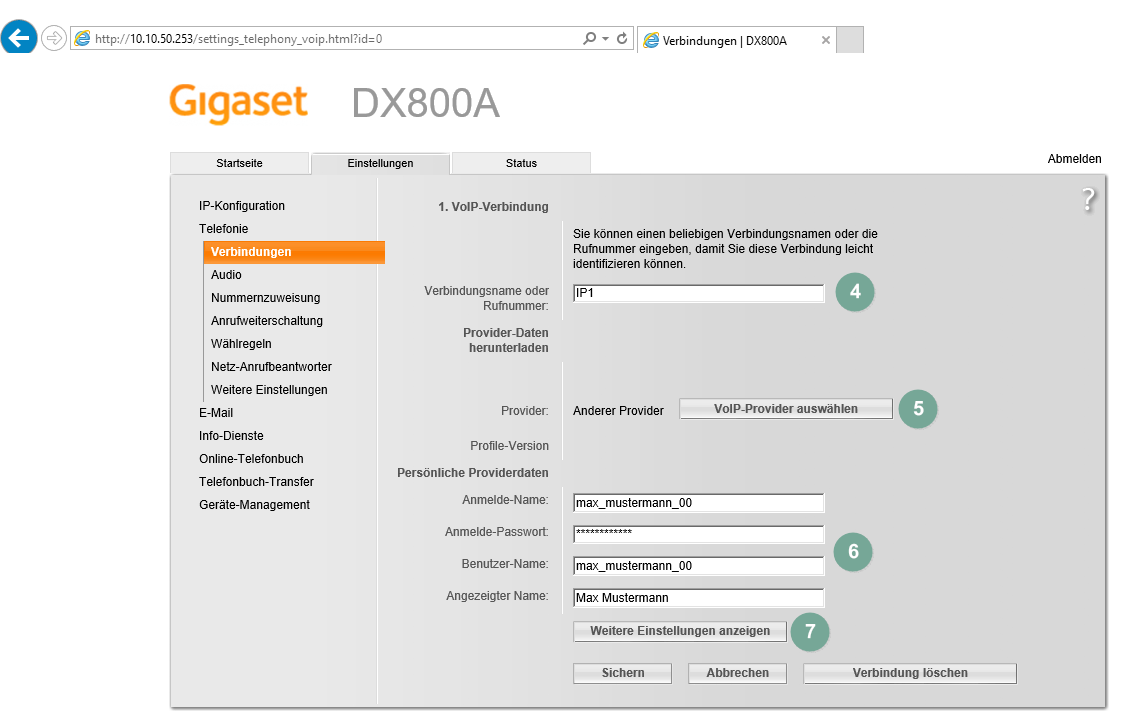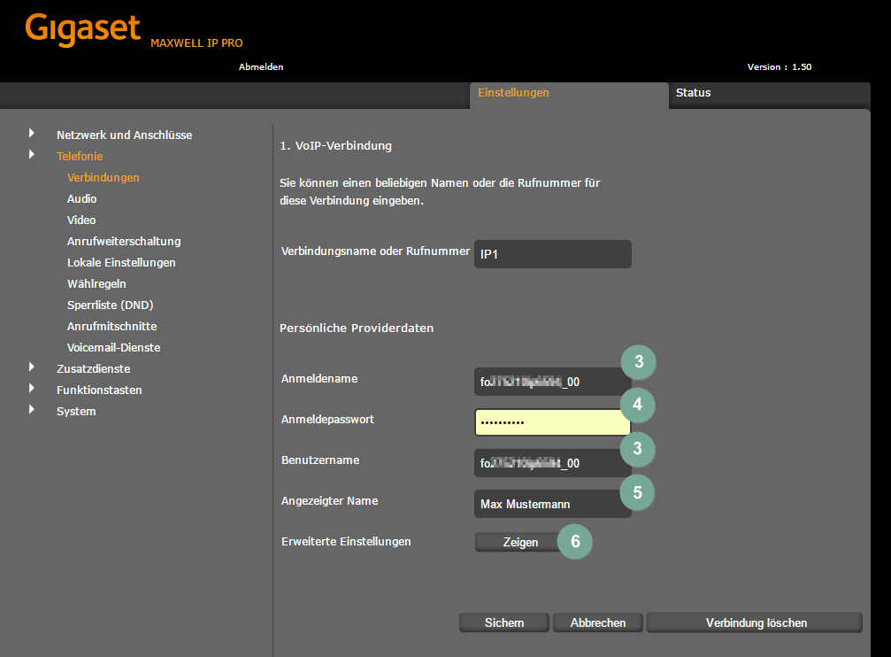- Bei „Persönliche Providerdaten“ geben Sie die SIP-Zugangsdaten ein. Sie finden Sie Ihrem Cloud PBX Konto. Wählen Sie auch einen „Angezeigten Namen“, der später auf dem Mobilteil auftaucht. Gehen Sie zu „Weitere Einstellungen“.