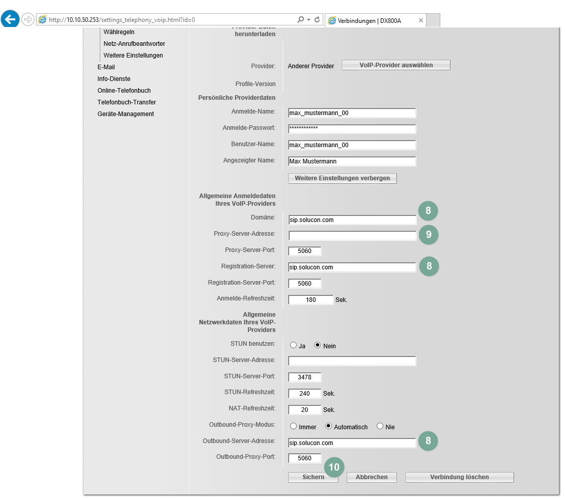 - Outbound-Server-Adresse füllen Sie aus mit: "sip.solucon.com".
