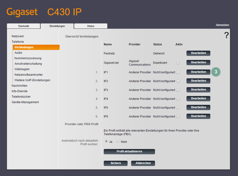 - Sie sehen die angemeldeten Mobilteile. Klicken Sie bei "IP1" auf "Bearbeiten". Wollen Sie mehrere Mobilteile anmelden, folgen Sie für jedes Mobilteil der unten stehenden Anleitung.