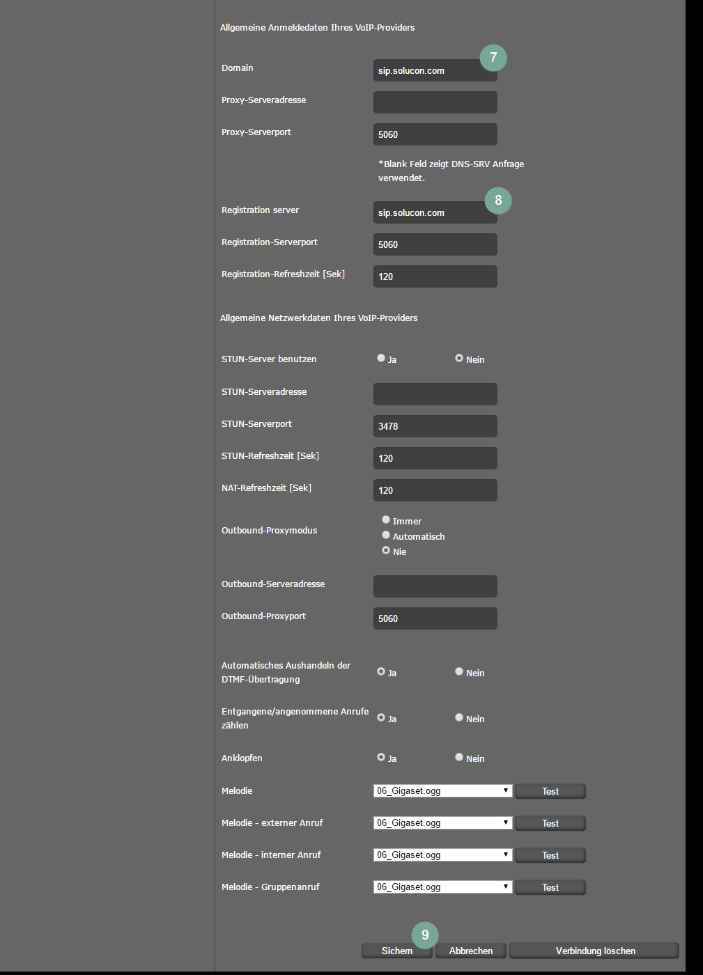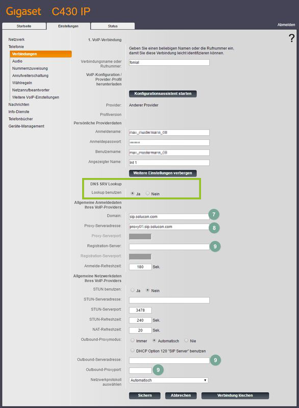 - Bei "Domäne" und "Registration-Server" geben Sie diese SIP-URL ein: "sip.solucon.com"