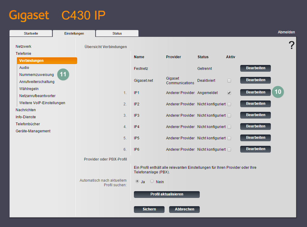 - Sie finden Ihre frisch eingerichtete IP-Verbindung bei den "IP-Verbindungen" mit dem Status "Angemeldet" und "Aktiv".