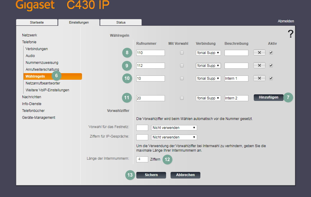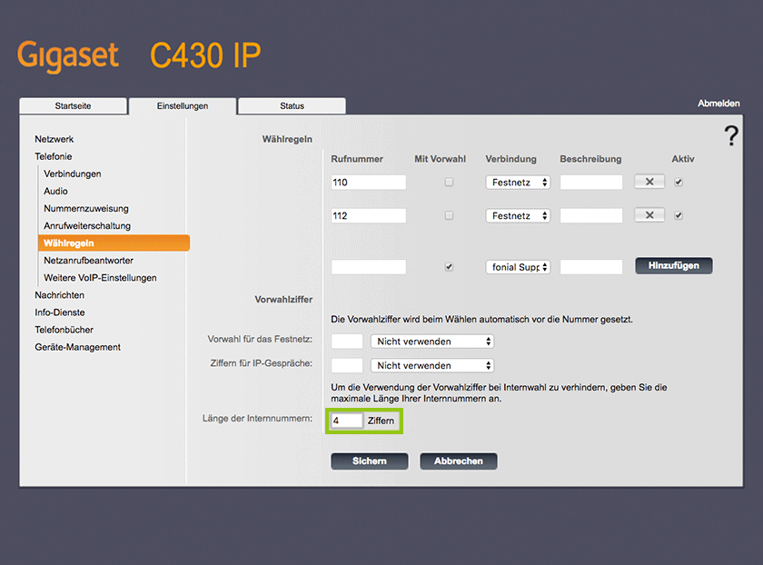 - Im linken Navigationsmenü gehen Sie auf "Wählregeln" und fügen bei "Länge der Internnummern" die "4" ein.
