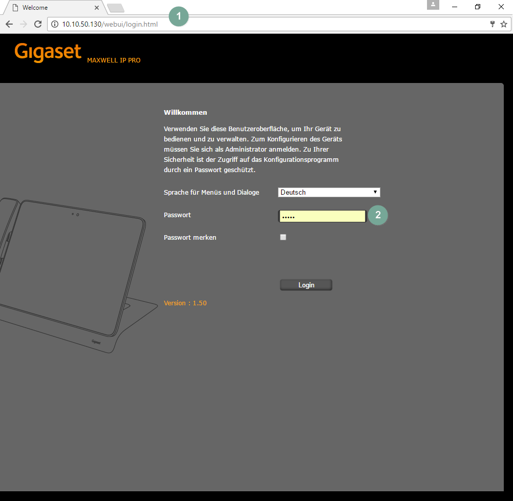 - Drücken Sie Enter, öffnet sich die Startseite Ihres Gigaset-Geräts im Web. Die Sprachauswahl "Please choose your language for menus and dialogues" stellen Sie auf Deutsch ein.