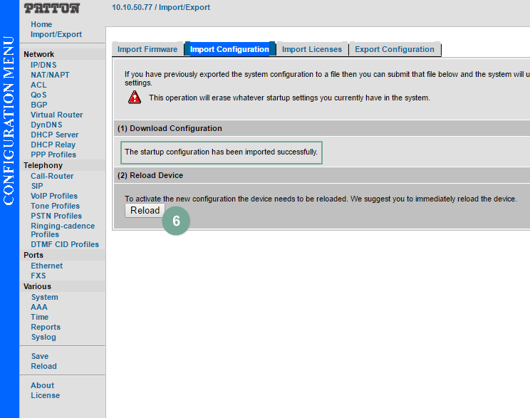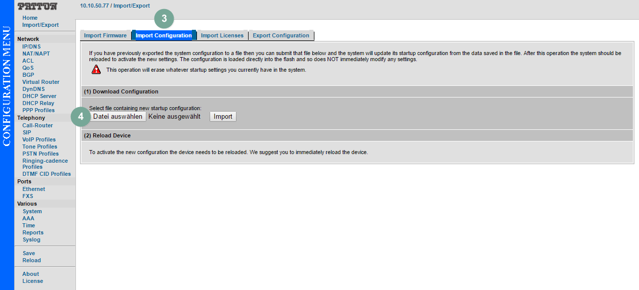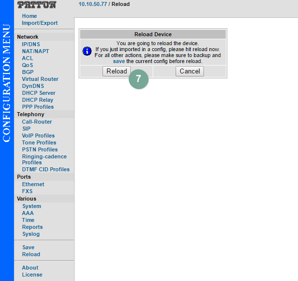 - Klicken Sie noch einmal auf "Reload". Das Gerät startet nun neu.