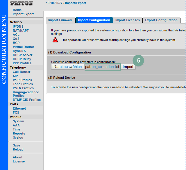 Wenn Sie den Patton Adapter einrichten, nutzen Sie dazu eine Konfigurationsdatei. In diese übertragen Sie die SIP-Benutzerdaten aus Ihrer Zwischenablage. Dann speichern Sie die Konfigurationsdatei auf Ihrem PC und importieren sie in Ihre Patton Administrator-Oberfläche.