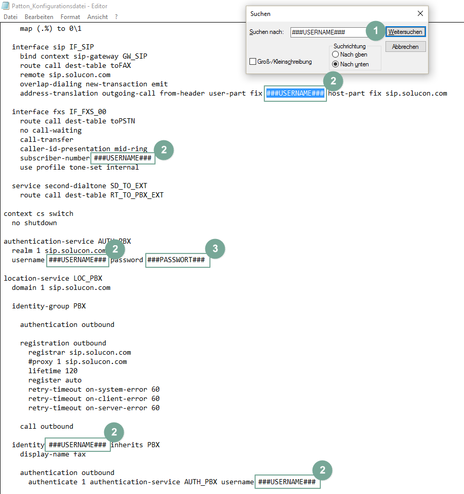 - Drücken Sie bei Windows die Tastenkombination "STRG+F" (Windows), drücken Sie bei Mac "cmd+F". In das Suchfenster geben Sie dann ###USERNAME### ein. Mit "Weitersuchen" finden Sie nun die Stellen, an denen Sie die zwischengespeicherten SIP-Daten aus dem SIP-Benutzerkonto eingeben müssen.