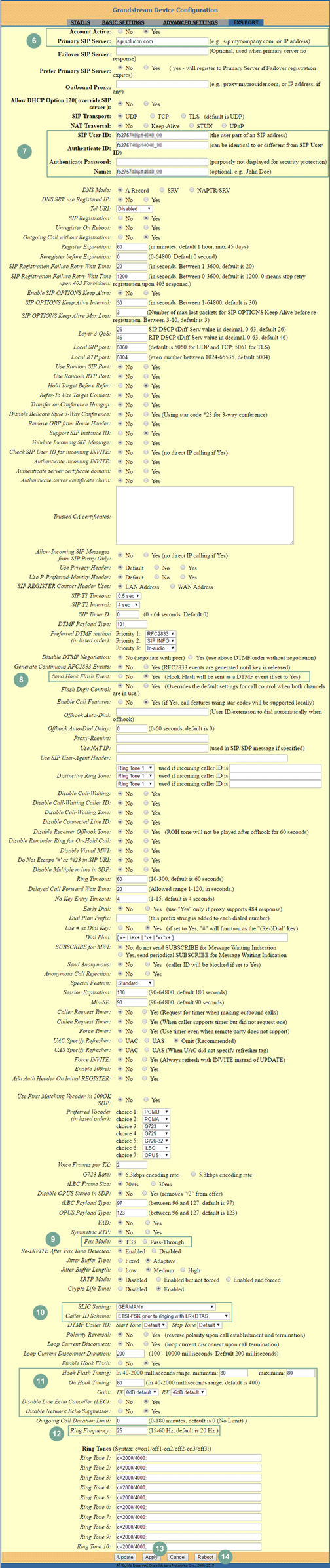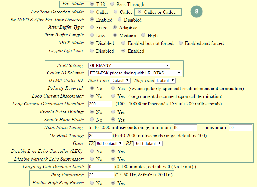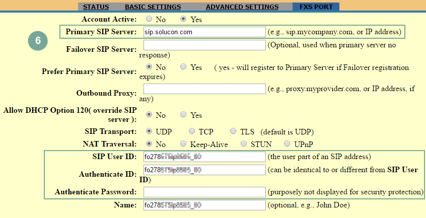 - Öffnen Sie die Registerkarte "FXS Port". Dort ändern Sie die Daten wie folgt: