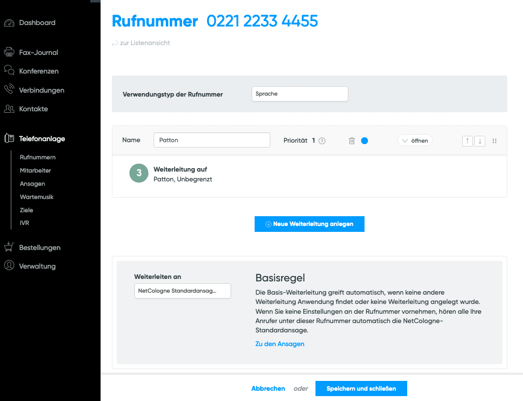 Im NetCologne Cloud PBX Konto: Ziel und Weiterleitung einrichten