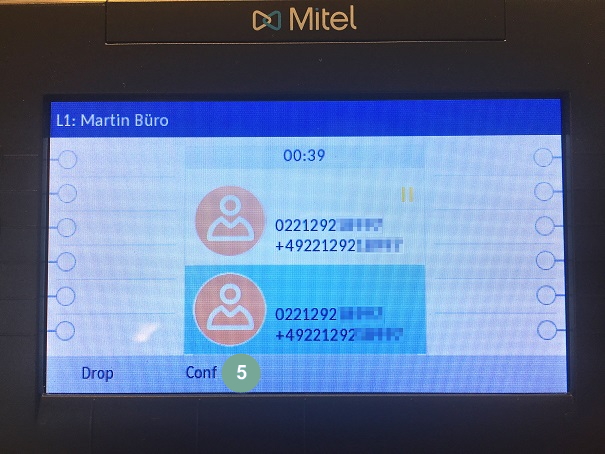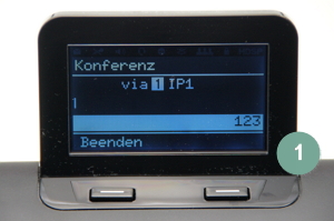 Während Sie telefonieren, ruft ein weiterer Teilnehmer an. Sie hören das Anklopfen und nehmen den anklopfenden Teilnehmer an. Nun starten Sie auf diese Weise die Konferenz: