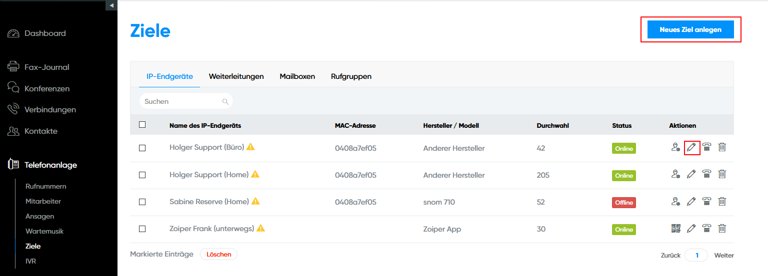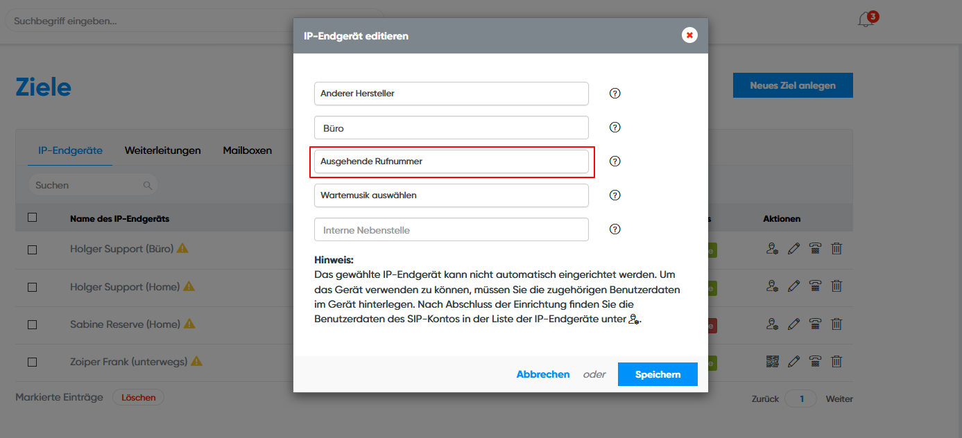 Achtung: Wenn Sie Ihr Telefon im Cloud PBX Konto einrichten, bestimmen Sie hier nur die ausgehende Nummer. Sie können dann noch nicht angerufen werden, sondern müssen erst Ihr Telefon mit der Rufnummer verbinden, unter der Sie angerufen werden wollen. Lesen Sie dazu mehr unter "Rufnummer einrichten".