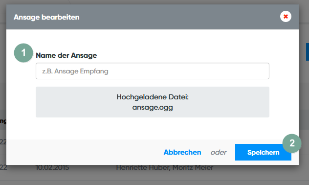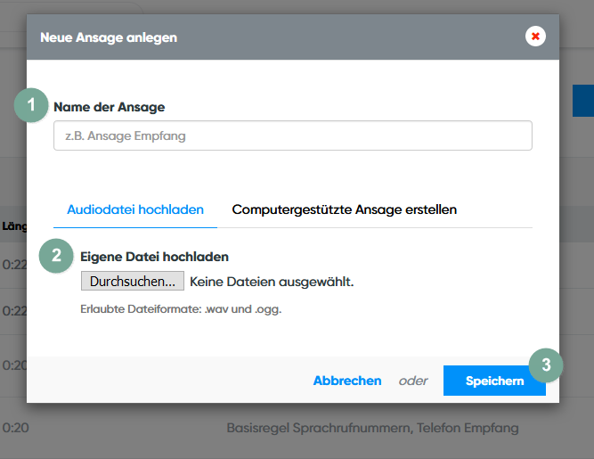 Wenn Sie eine "Neue Ansage anlegen" gewählt haben, sehen Sie den oben stehenden Bildschirm.