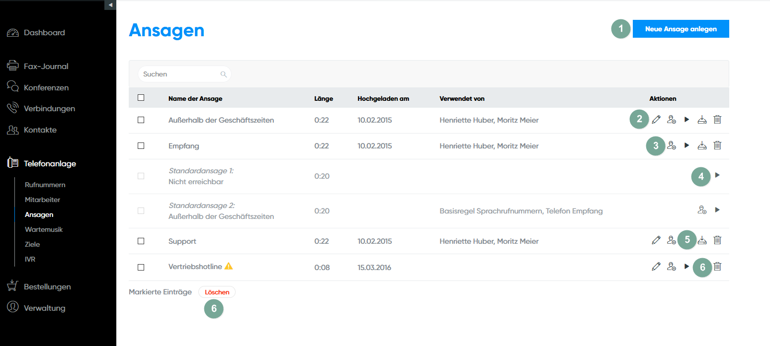 Unter dem Menüpunkt "Ansagen" haben Sie Zugriff auf die unterschiedlichen Ansagen für Ihr Unternehmen. Mailboxen oder IVRs können diese nutzen. Nähere Informationen und Anleitungen finden Sie unten stehend.