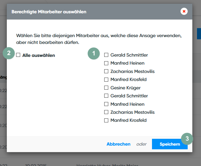 Haben Sie das Personen-Symbol geklickt, um damit berechtigte Mitarbeiter auszuwählen, sehen Sie diesen Dialog. Wählen Sie nun aus folgenden Möglichkeiten: